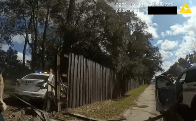 Officer bodycam video during the pursuit, which traveled South on Interstate 95 to Interstate 10 and South on Roosevelt Boulevard, shows an officer involved in the chase prior to crashing into a second patrol unit. The collision caused both vehicles to carom in different directions. One patrol unit smashed through a fence and the other struck a citizen’s SUV head-on.