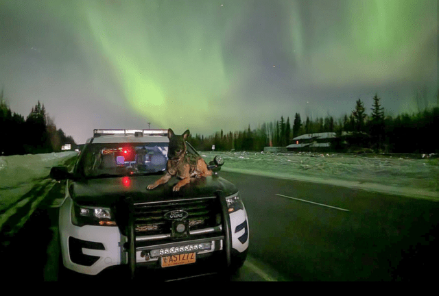 “We really do have the best views in the world both day and night,” noted the agency’s Facebook post. “Trooper Hibbs took this photo with K9 Lenox while waiting for a tow truck to clear a scene near Fairbanks. Waiting isn’t so bad when the lights are out.”