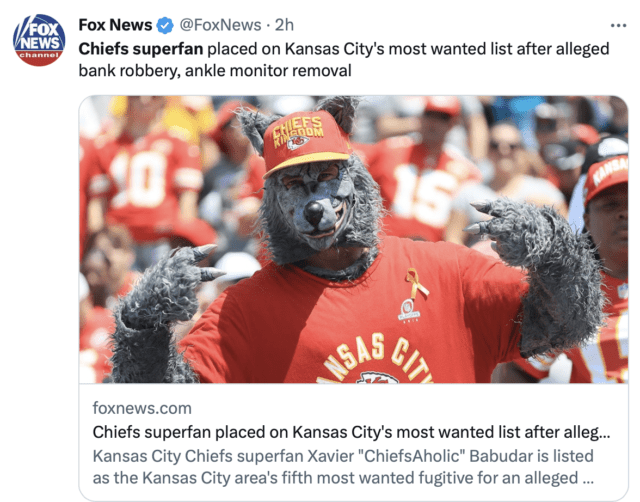 Xavier “ChiefsAholic” Babudar, better known to Chiefs fans as the guy who wears a KC Wolf costume to home games, is accused of robbing an Oklahoma bank in December according to Fox News.