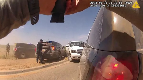 LAS CRUCES, N.M. — Gunfire from an intense shootout following a pursuit narrowly missed two officers in patrol vehicles, body camera footage from the Las Cruces Police Department shows.