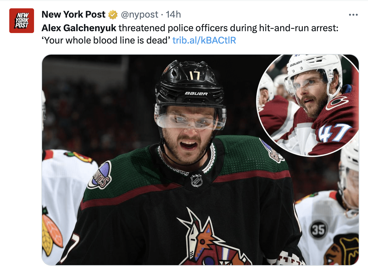 Alex Galchenyuk was arrested after crashing a car into a sign, and subsequently threatened the officers.
