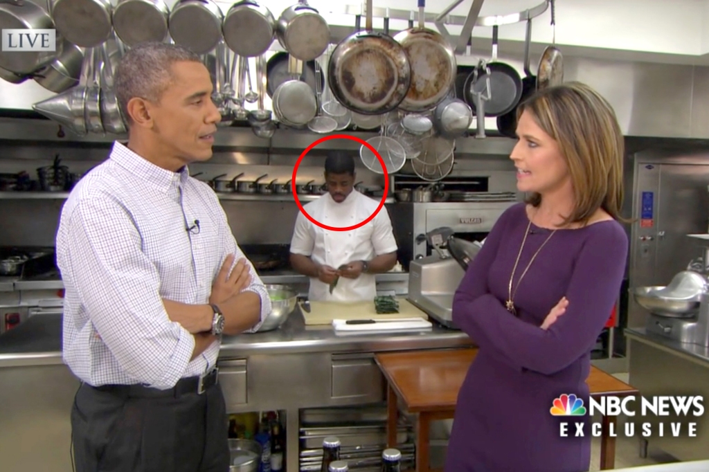 Tafari Campbell (highlighted in the center) was the Obama family’s personal chef. President Barack Obama (left), is pictured during an interview with Savannah Guthrie for the “Today” show.