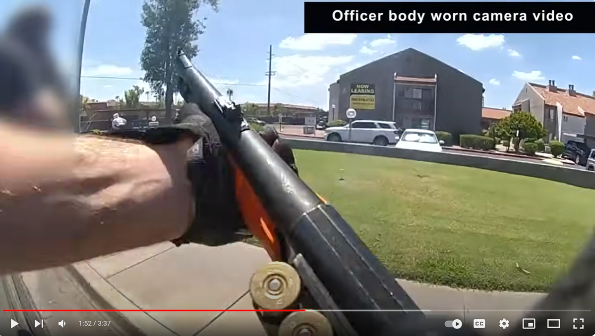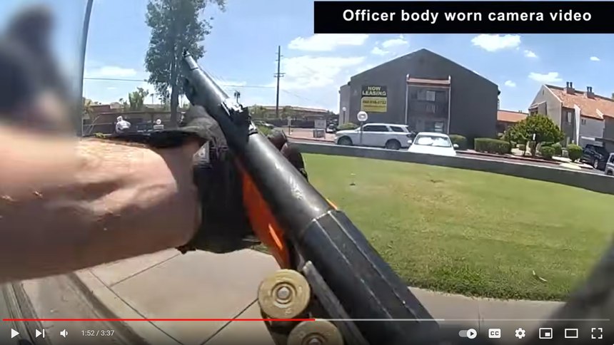 MESA, Ariz. — Body-worn camera video from the Mesa Police Department shows the moment officers confronted an armed suspect with non-lethal rounds from a moving cruiser.