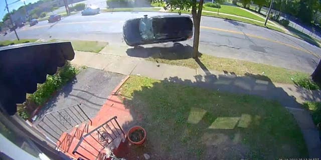 The dramatic incident occurred in the New York neighborhood on Wednesday, at approximately 4:30 p.m., WHEC reported. The doorbell camera captures the black SUV turning quickly onto the street when it loses control and flips over.