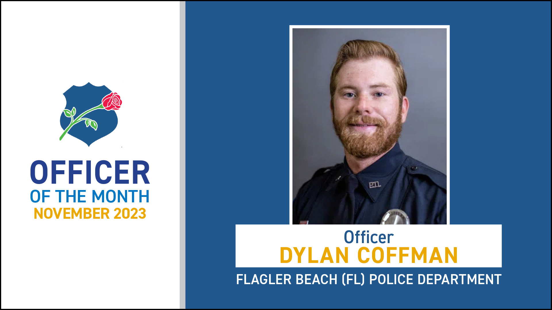 The National Law Enforcement Officers Memorial Fund (NLEOMF) on January 18 announced Officer Dylan Coffman of the Flagler Beach, Florida, Police Department as its Officer of the Month for November 2023. Coffman was selected for his bravery and heroism when he rescued two swimmers who were in distress while caught in a rip current in the Atlantic Ocean.