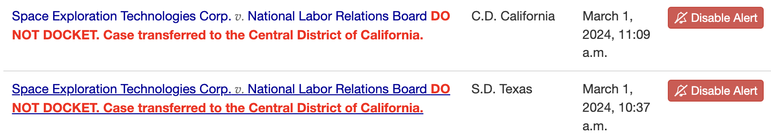 Without opining on the merits of Space X’s claim that it would be grievously injured if forced to go through with the March 5 NLRB hearing, the Fifth Circuit administratively stayed the transfer on February 19. But since the transfer was already in process, Judge Marshall docketed the case in California on February 23.