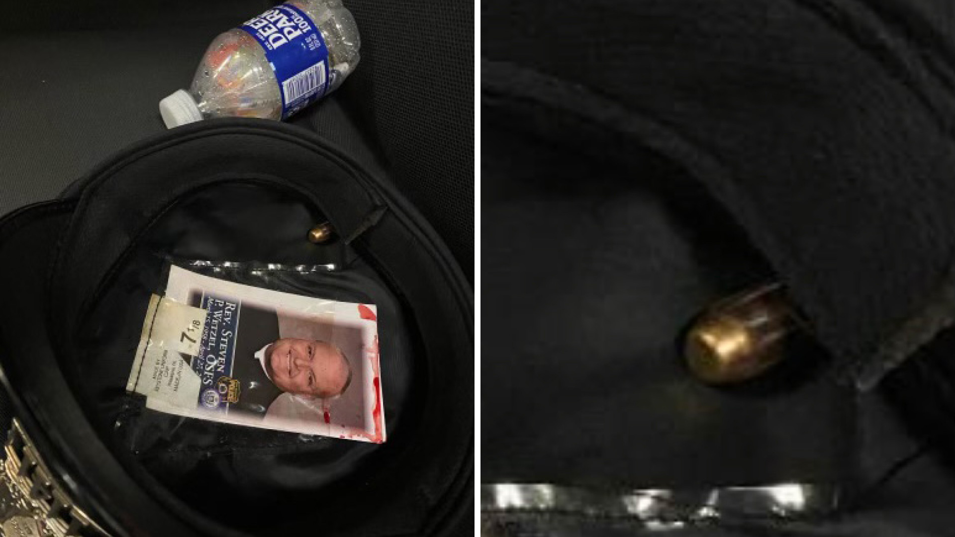 A photo released by John McNesby, the president of Philadelphia Fraternal Order of Police Lodge #5, shows the bullet stuck inside the hat, along with bloodstains and a memorial card for a recently deceased police chaplain, Father Steven Wetzel.