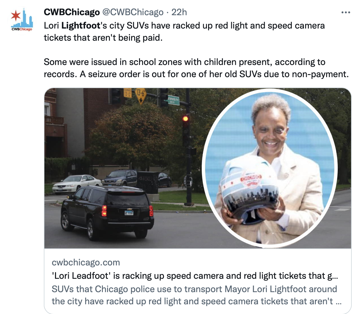 Additionally, CWB Chicago reported that one of the SUVs in the mayor’s fleet has a red light ticket that has not been paid and two SUVs that were previously assigned to Lightfoot’s security detail have outstanding speed and red light tickets.