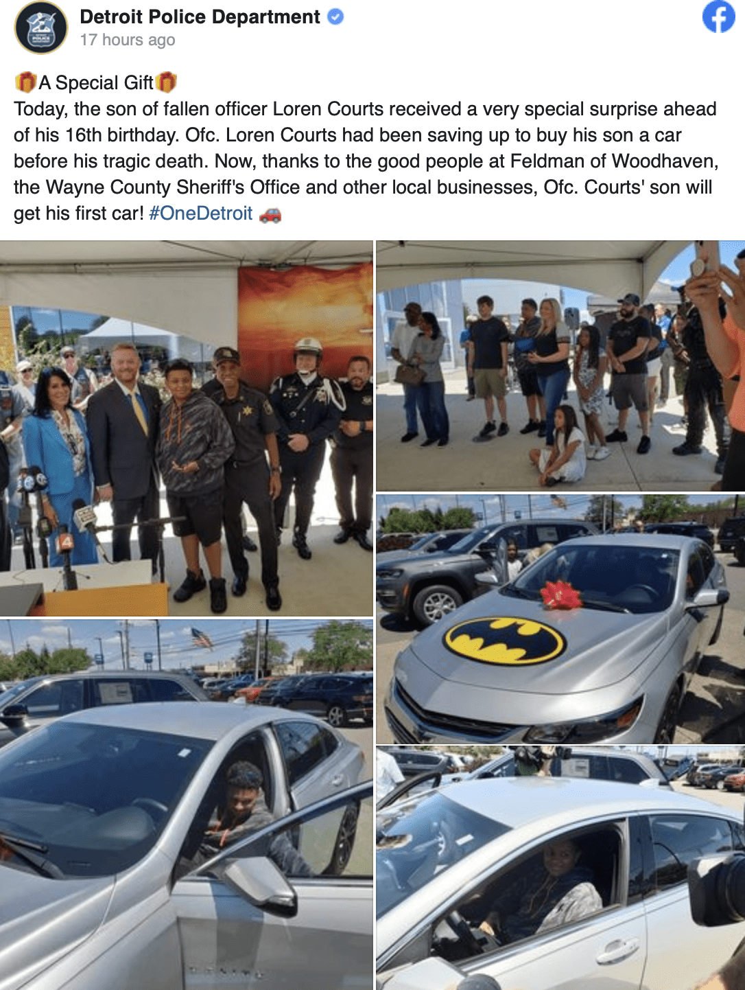 Darian Courts, son of officer Loren Courts, who was killed in the line of duty on July 6, was gifted a car by the department ahead of his 16th birthday, according to a Facebook post made by the Detroit Police Department.