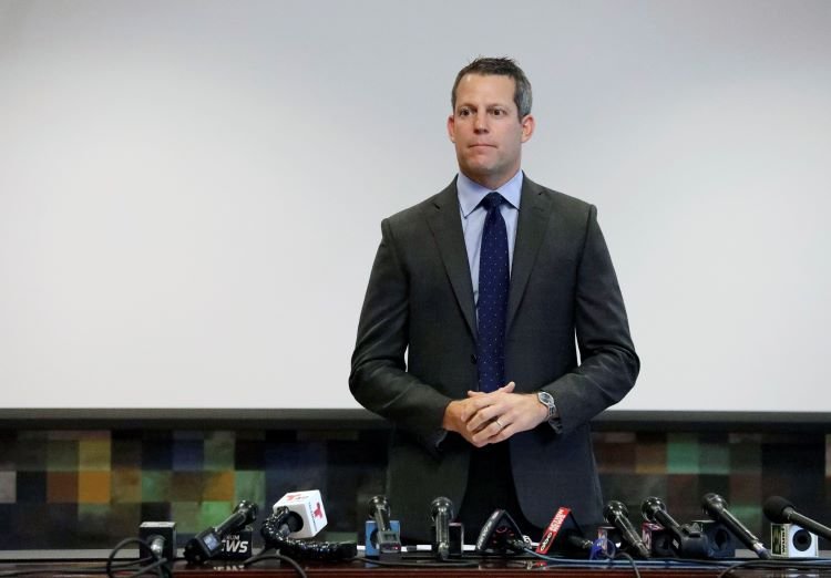 State Attorney Andrew Warren attends a press conference hours after Republican Florida Gov. Ron DeSantis suspended him because of neglect of duty Thursday in Tampa, Florida. Photo by Douglas R. Clifford/The Tampa Bay Times via the Associated Press.