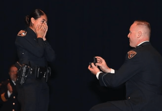 The proposal was captured in photos and shared on the department Facebook page. According to the agency, it is the first time a marriage proposal has taken place at an academy graduation in department history.