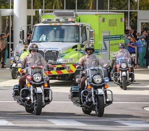 Police escort the body of Miami-Dade Police Detective Cesar Echaverry from Jackson Memorial Hospital to the Miami-Dade County Medical Examiner’s Department on Friday, Aug. 19, 2022. (Al Diaz)